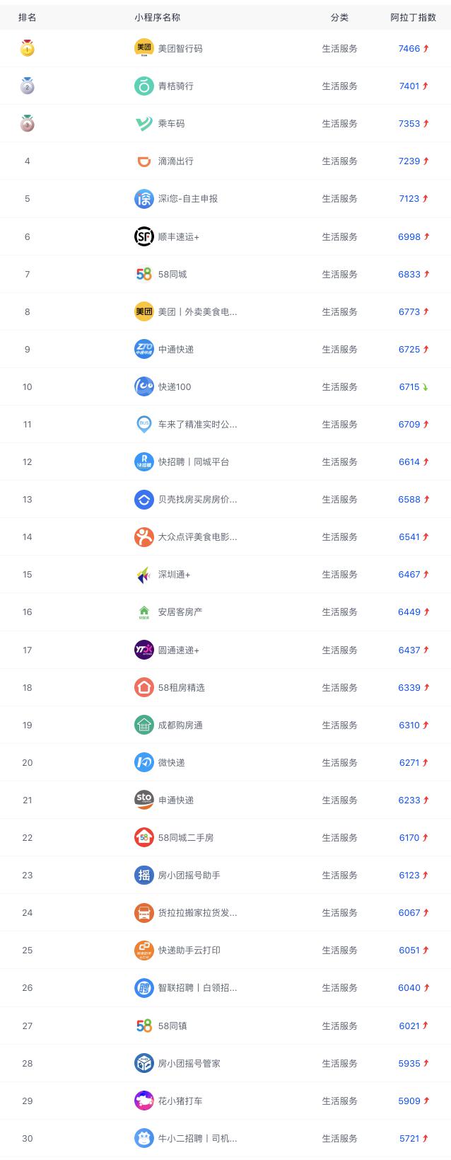 在本周生活服務周榜 TOP30 中,出行類小程序「美團智行碼」、「青桔騎行」和「乘車碼」分別位列生活服務周榜前三。