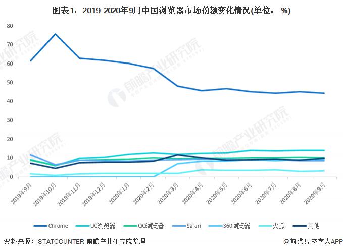 瀏覽器是用來檢索、展示以及傳遞 Web 信息資源的應用程序,是我們瀏覽網頁的必備介質。近年來,谷歌瀏覽器占據了我國瀏覽器市場大量的市場份額,但自 2020 年以來,我國國產瀏覽器開始發力,谷歌瀏覽器市場份額開始不斷下降。截止 2020 年 9 月,谷歌瀏覽器市場已降至 44.57%; 其后的 UC 瀏覽器、QQ 瀏覽器和 360 瀏覽器的市場份額分別為 14.28%、10.09% 和 9.30%。