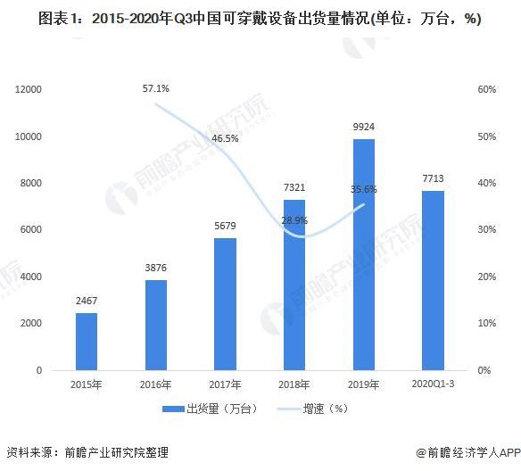 隨著全球可穿戴設備市場的逐漸興起,可穿戴設備出貨量不斷增長。中國可穿戴設備市場也迎來高速增長,中國市場逐漸成為全球可穿戴設備市場的核心。中國可穿戴設備出貨量持續增長,2019 年我國可穿戴設備出貨量達到 9924 萬臺,同比增長 35.6%,增幅較大。雖然 2020 年新冠疫情對于消費市場造成一定沖擊,但是僅在第一季度實現下滑,之后快速恢復,仍實現增長。2020 年前三季度實現 7713 萬臺的出貨量。