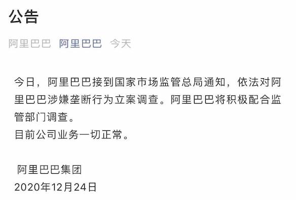 今日,阿里巴巴接到國家市場監管總局通知,依法對阿里巴巴涉嫌壟斷行為立案調查。阿里巴巴將積極配合監管部門調查。目前公司業務一切正常。