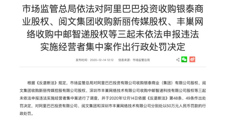 雷鋒網注意到, 就在十天前的 12 月 14 日,國家市場監管總局也發布公告稱,根據《反壟斷法》舉報,市場監管總局針對對三起未依法申報違法實施經營者集中的案件,向三個市場主體作出行政處罰的決定。