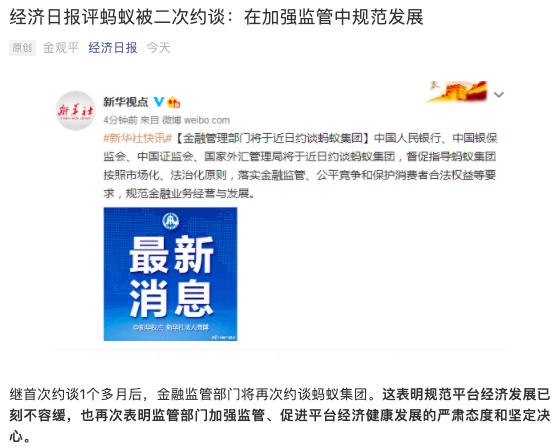 與此同時,新華社又發布消息稱,相關國家金融管理部門將于近日約談螞蟻集團。