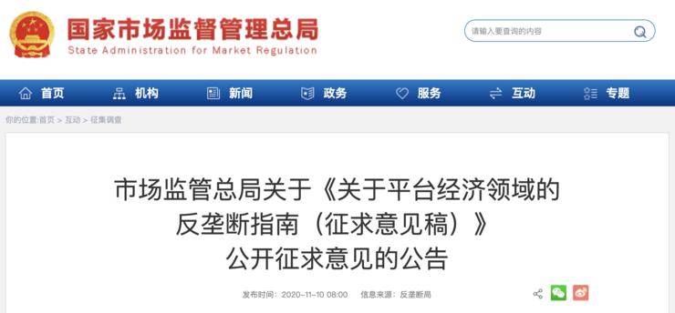 到了 11 月 10 日,國家市場監督管理總局發布了關于《關于平臺經濟領域的反壟斷指南(征求意見稿)》(以下簡稱《指南》)公開征求意見的公告——這個《指南》被認為是直接針對互聯網平臺的反壟斷監管規則。