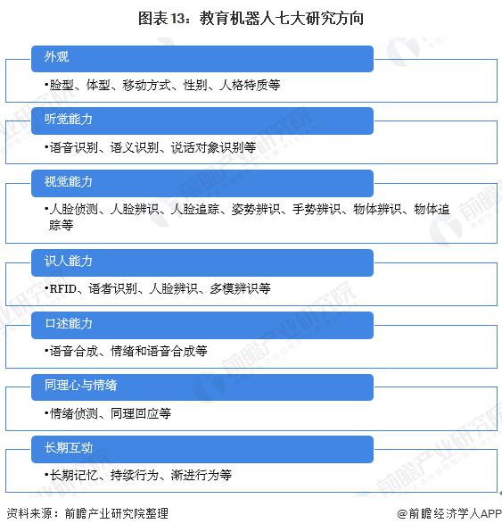 教育機器人研究關注的七個研究方向即:外觀、聽覺能力、視覺能力、認人能力、口說能力、同理心與情緒以及長期互動。其中,外觀是教育機器人設計的重要問題,也是目前研究最為普及和深入的領域,因為特別是對兒童而言,外觀會影響兒童對機器人好惡的評判,不良的外觀甚至會讓兒童產生恐懼感與夢魘,從而直接反應在教學效果上 ; 聽覺能力、視覺能力、認人能力、口說能力方面的研究也已有所突破 ; 但是同理心與情緒以及長期互動的研究還處于相對初級的階段,是未來技術突破的重點。