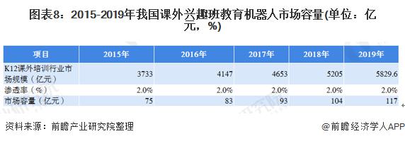 由于機器人教育在學校課堂的滲透率較低,在學生家長尤其是中產階級家長的教育焦慮和收入提高下,課外機器人教育的市場茂盛生長。商業機構培訓對行業趨勢敏感,發展最早,目前全國已有數千家培訓機構,各階段產品、培訓各個環節均有涉及。以 2% 的市場滲透率進行測算,2018 年我國課外興趣班教育機器人市場空間已經突破 100 億元,2019 年市場容量約 117 億元。